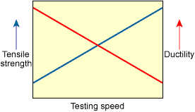 Figure 4 shows how the tensile strength increases but ductility decreases as the testing speed is increased. The speed of the cross head of the tensile machine therefore needs to be controlled and BS EN 10002 specifies a stress rate range of 6MPa per second to 60MPa per second. The ASTM specifications have similar - but not identical - requirements.